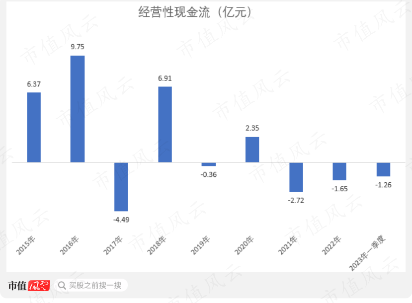 不仅如此,经营性现金流也基本上年年为负,所以靠主营业务造血基本别想了。