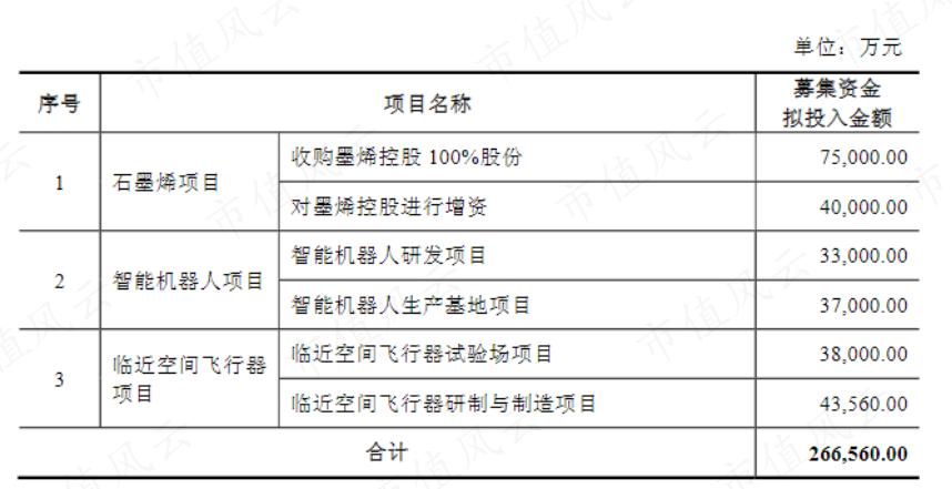 同年5月,公司发布定增计划,拟向控股股东募资26.7亿,用于收购墨烯控股(主要子公司为宁波墨西、重庆墨希),以及智能机器人和临近空间飞行器项目。