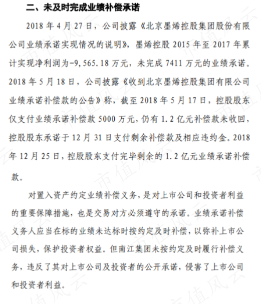 收购之时,对手方兼自家大股东南江集团与公司签订了业绩承诺,即2015-17年,承诺净利润不低于7,411万,最后墨烯控股3年累计亏损9,565万。