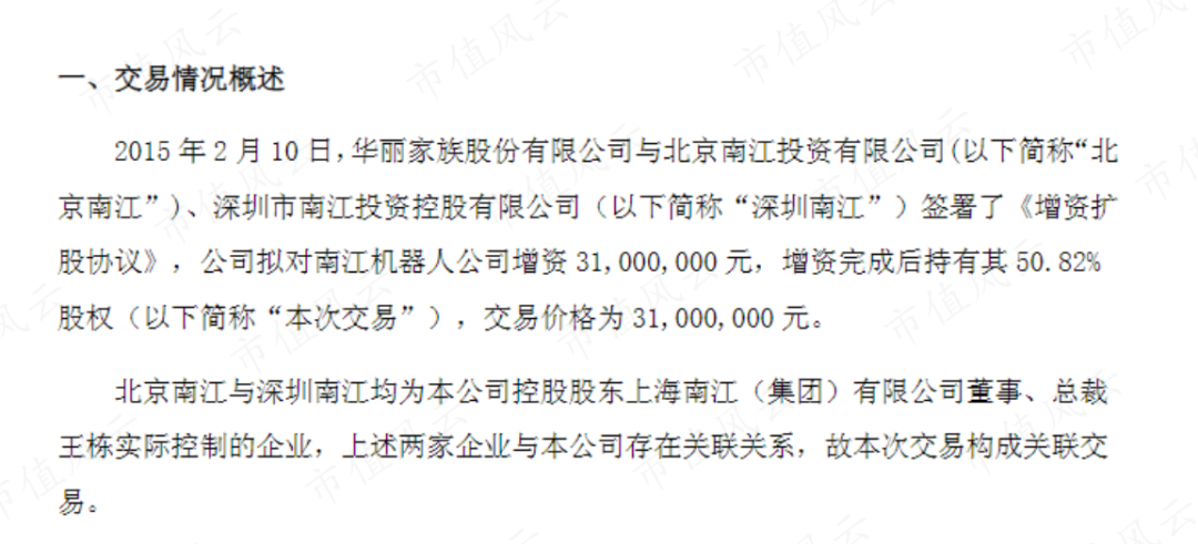 (来源:华丽家族股份有限公司关于增资收购杭州南江机器人股份有限公司50.82%股权暨关联交易的公告)