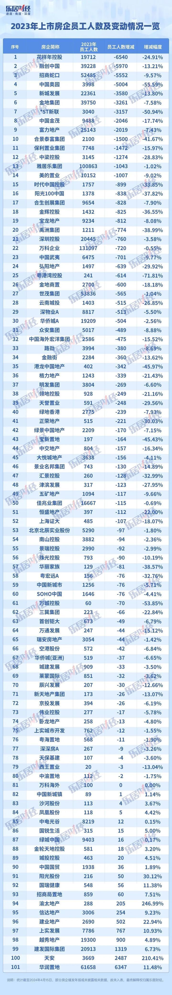 据乐居财经统计,2023年,101家上市房企的总员工人数为82.92万,同比2022年,减少了4.78万。平均下来,统计范围内的房企在去年平均减少了473人。
