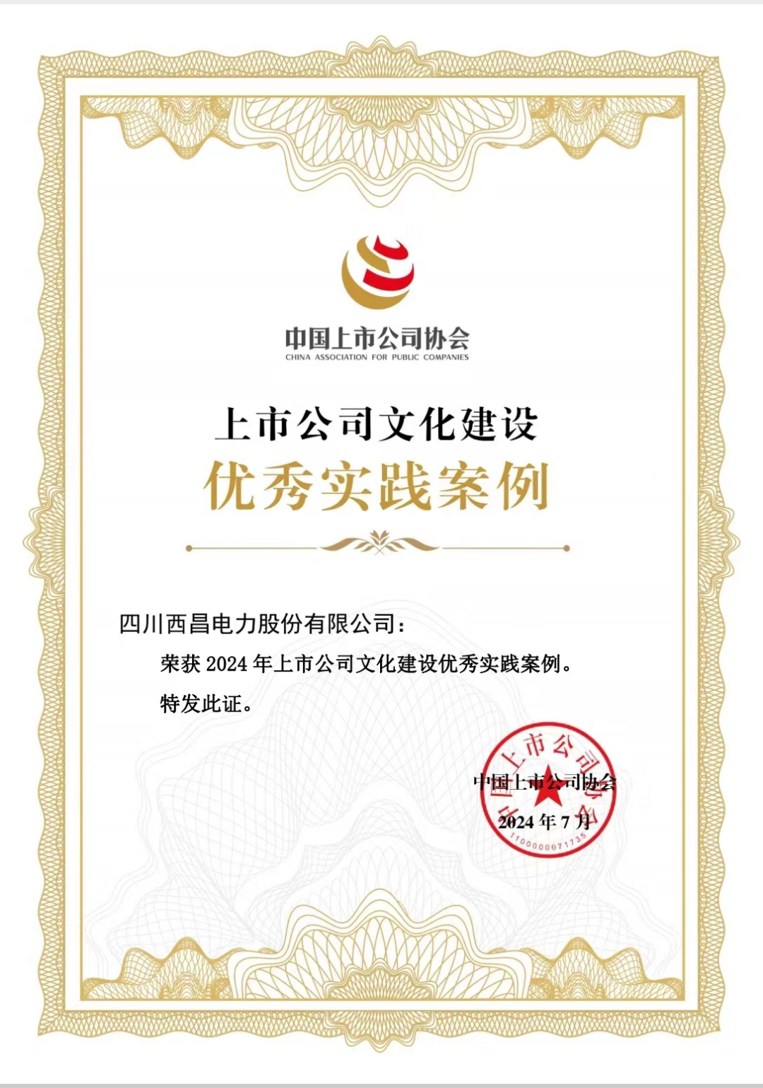在中国上市公司协会3月份组织开展的“上市公司文化建设最佳实践案例征集活动”中,公司结合自身企业文化建设特色,通过川兴供电营业所综合示范点具体案例展示了公司在文化建设中依法合规、诚实守信、稳健经营、回报社会等方面的具体举措和创新做法。经积极申报,最终入选上市公司文化建设优秀实践案例。