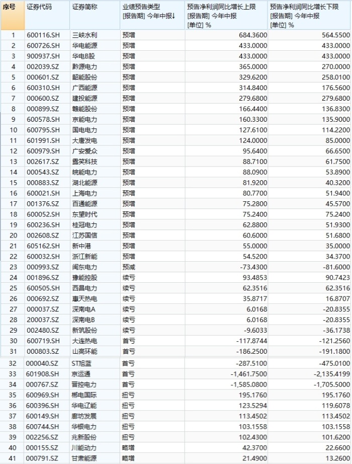 数据显示,申银万国行业SW电力板块105家上市公司中,有41家披露2024年上半年业绩预告,其中黔源电力(002039.SZ)等22家公司实现预增,川能动力(000155.SZ)等2家公司略增,彬电国际(600969.SH)等5家公司实现扭亏,闽东电力(000993.SZ)1家公司业绩预减,西昌电力等6家公司续亏,大连热电(600719.SH)等5家公司出现首亏。