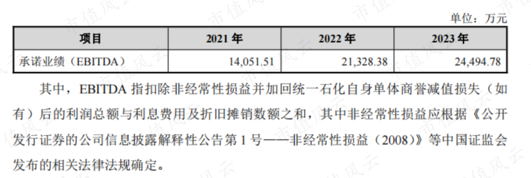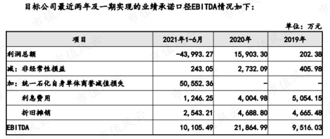 其中,承诺业绩指扣除非经常性损益并加回统一石化自身商誉减值损失后的利润总额与利息费用及折旧摊销数额之和,要知道,标的资产统一石化在2021年6月底,账面在减去5.06亿后,仍有7.1亿商誉。