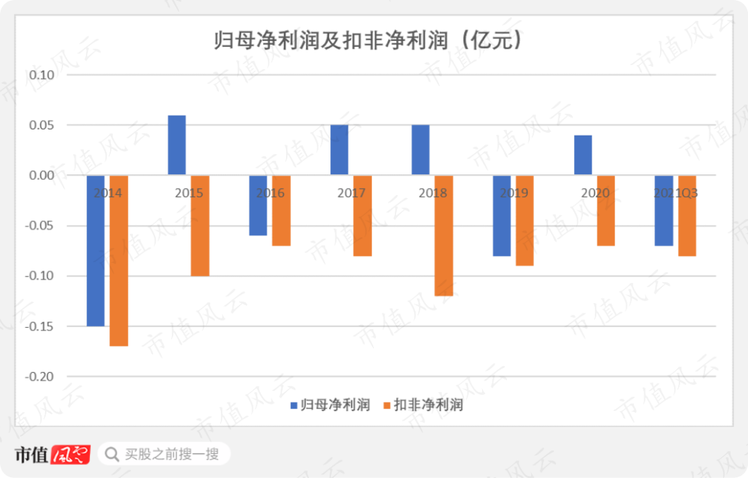 2014-2021Q3,公司归母净利润累计亏损0.16亿,扣非净利润累计亏损0.77亿。