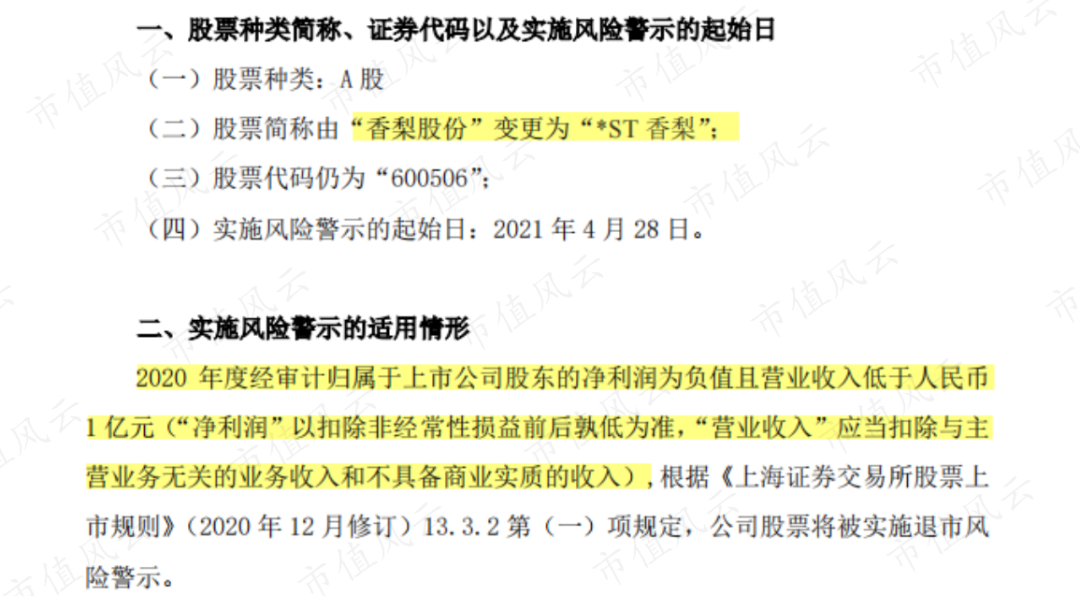 2021年4月,公司发布退市风险警示公告,因2020年净利润为负且营收低于1亿,公司简称变更为“ST香梨”,恰好撞在退市新规的“枪口”上。