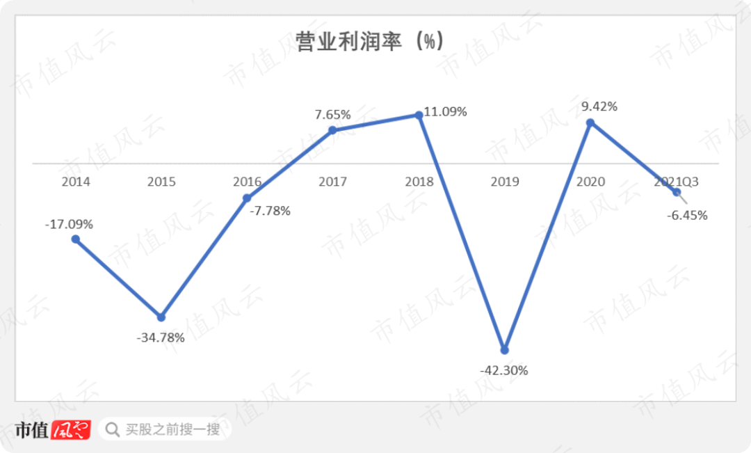 同时,2014-2021Q3公司实现的营业利润总计为-0.39亿,营业利润率的趋势上蹿下跳,且大部分时候处于负值。