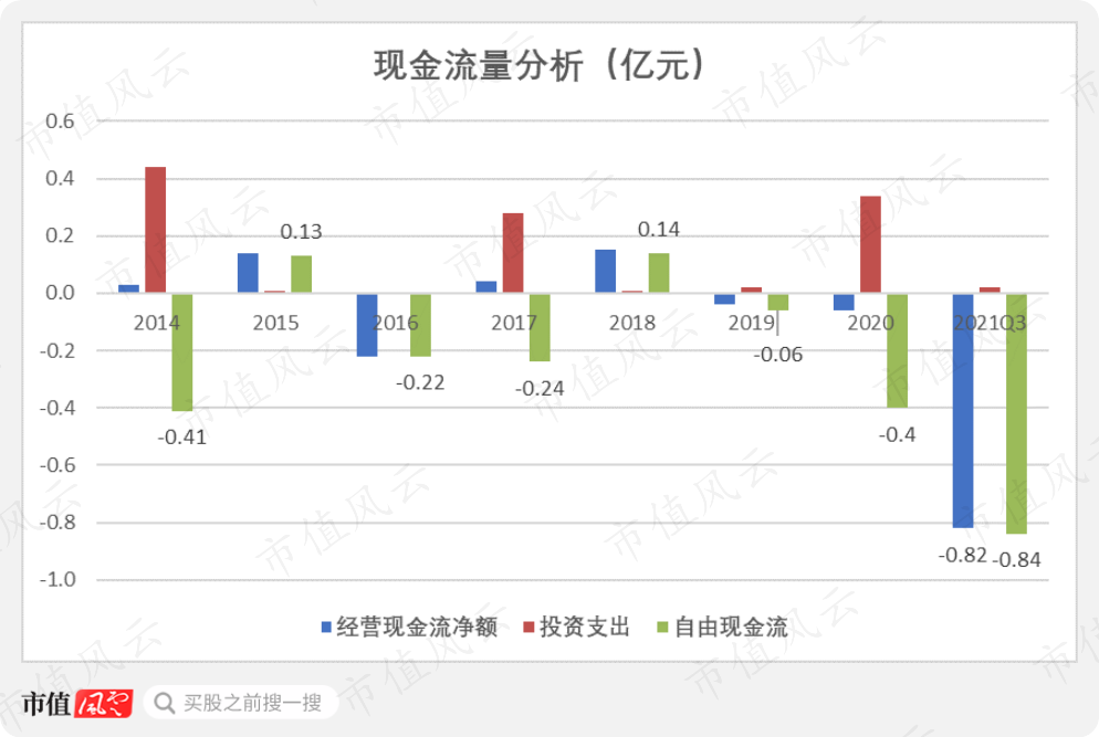 2014-2021Q3,公司的经营活动产生的现金流量累计净流出0.78亿,特别是从2019-2021Q3这两年多时间就净流出了0.92亿。