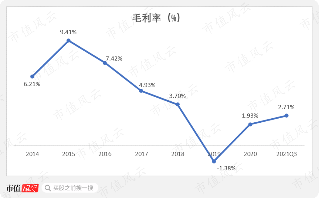 公司的综合毛利率整体处于下降趋势,从2015年的最高点的9.41%到当前2021Q3的2.71%,其中2019年综合毛利率甚至仅为-1.38%。