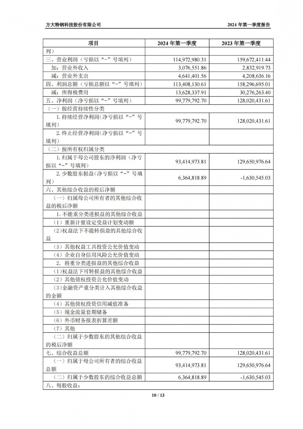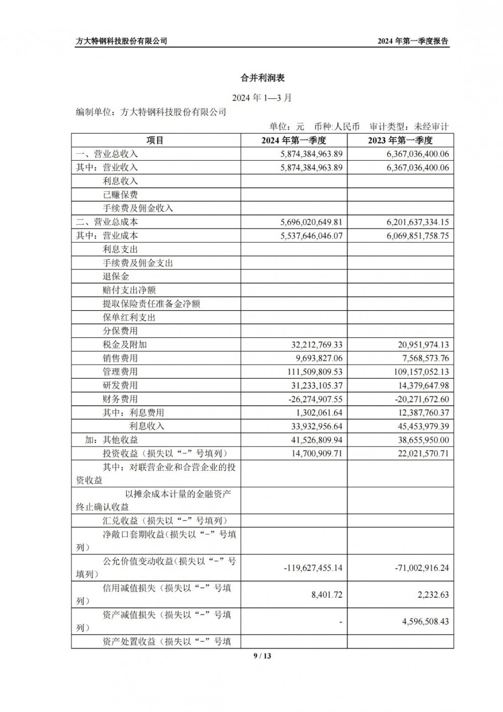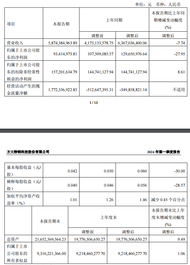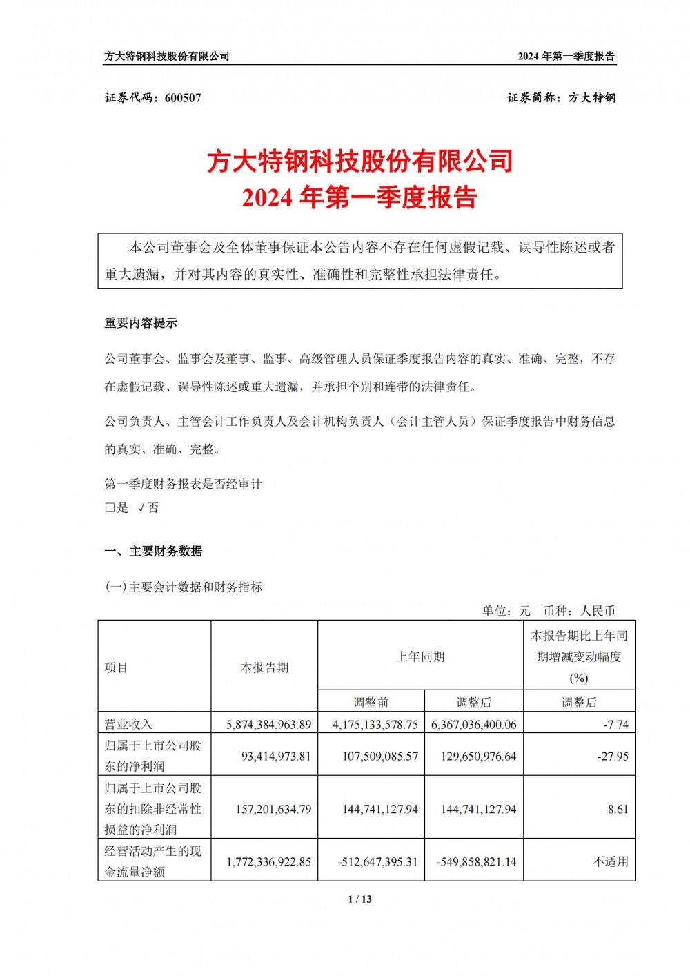 近日,方大特钢发布2024年第一季度报告。2024年第一季度,公司营收约58.74亿元,同比减少7.74%;归属于上市公司股东的净利润约9341万元,同比减少27.95%。基本每股收益0.042元,加权平均净资产收益率1.01%。