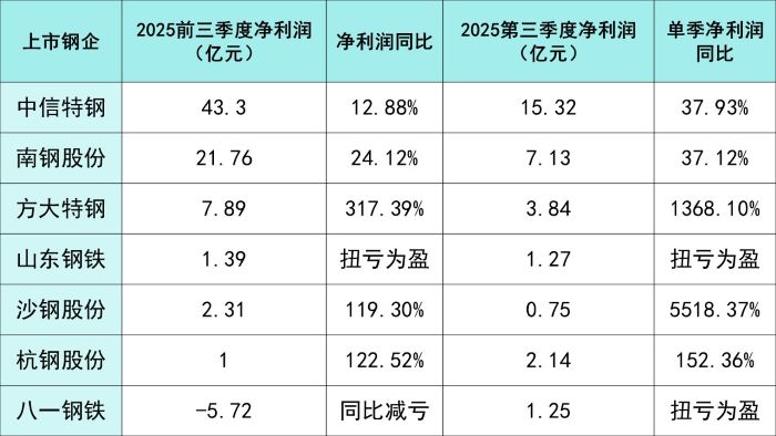 在钢铁行业“稳增长、防内卷”的政策框架下,2025年三季度特钢板块交出超预期答卷。多家上市钢企顶住行业价格下行压力,实现盈利大幅修复,其中以 方大特钢 、 沙钢股份 的三季度净利润反弹最为突出。