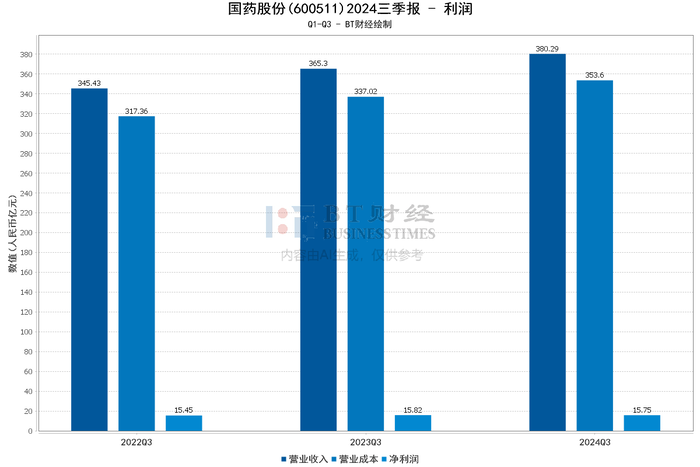在利润方面,国药股份的营业收入在本报告期内达到132.72亿元,同比增长7.12%。年初至报告期末的营业收入为380.29亿元,同比增长4.10%。尽管营业收入有所增长,但归属于上市公司股东的净利润增幅较小,仅为0.64%。净利率也从上年同期的4.33%下降至4.14%,反映出公司在盈利能力方面面临一定压力。