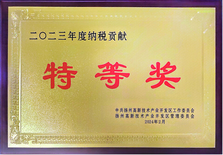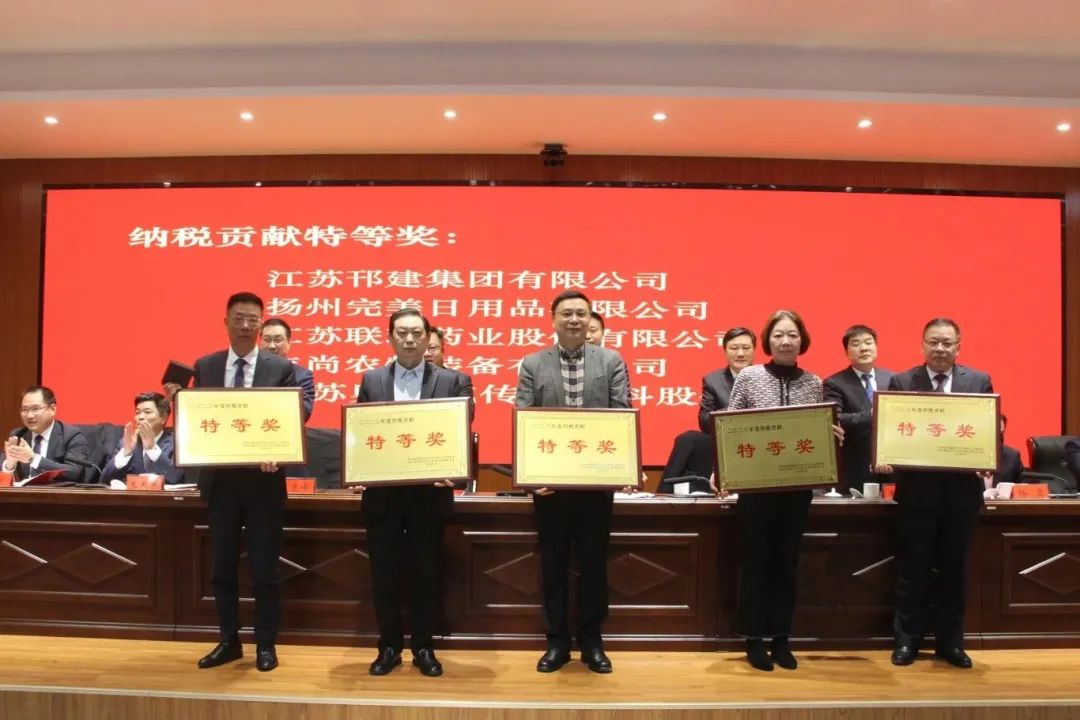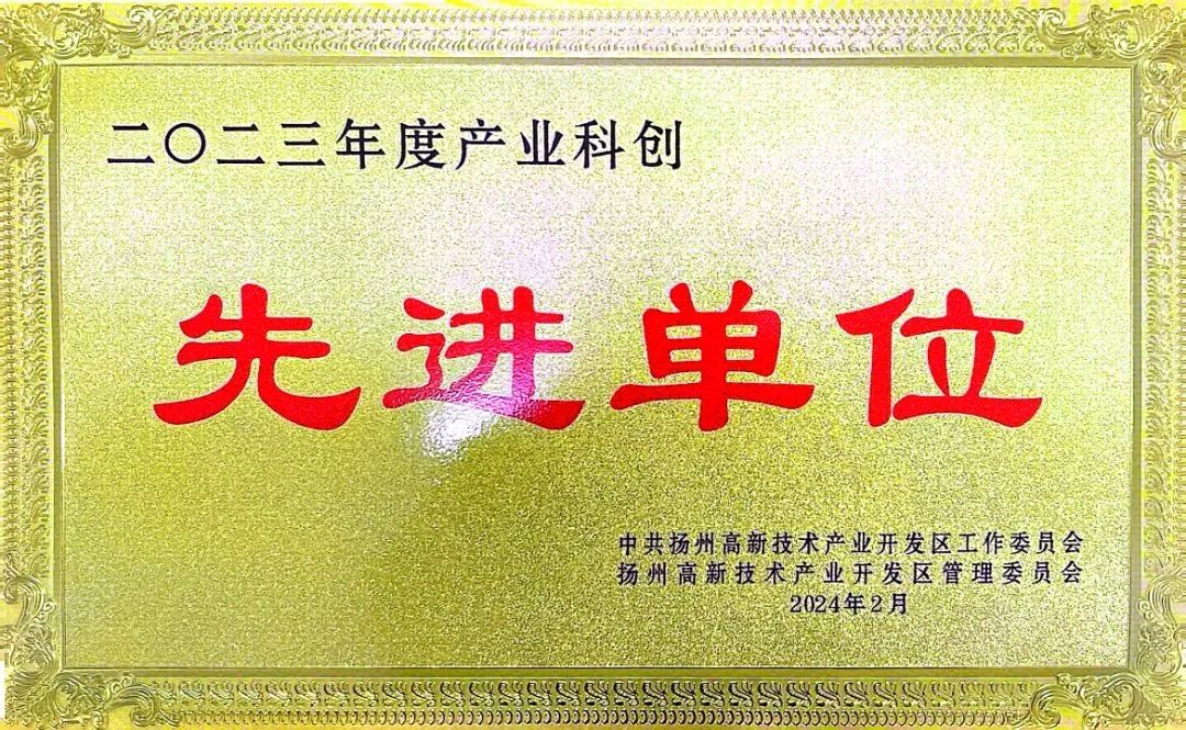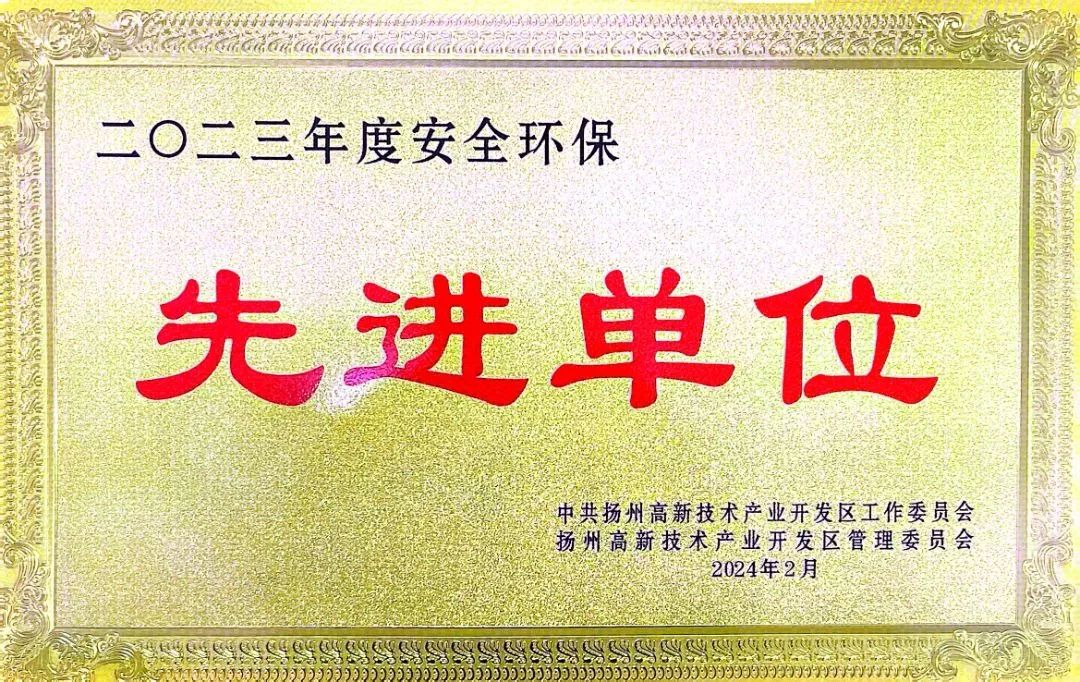 2月20日下午,扬州市高新区2023年度经济社会发展表彰暨2024年度“产业科创、实干争先”推进大会顺利召开,联环药业以优异成绩和突出贡献荣获2023年度“纳税贡献特等奖”、“产业科创先进单位”、“安全环保先进单位”。