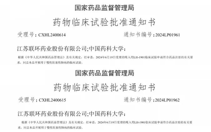 近日,联环药业收到国家药品监督管理局核准签发的《药物临床试验批准通知书》,公司1类新药吸入用LH-1901获得药物临床试验批准。