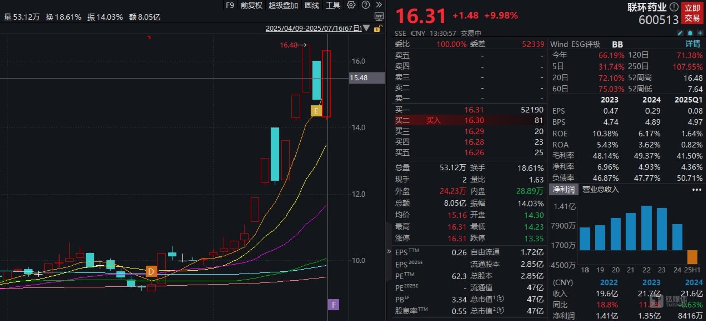 市场似乎愿意倾听这样积极寻求突破的故事,再叠加新增商保创新药目录的行业利好预期,在经历一个交易日的跌停后,联环药业延续强势行情,斩获8天6涨停,累计涨幅达50.88%。