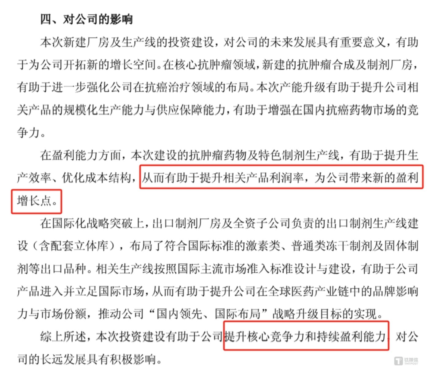 7月15日,联环药业公告称计划和全资子公司扬州制药各出资1.5亿元建设三栋厂房,包括出口制剂厂房、抗肿瘤合成厂房和抗肿瘤制剂厂房。其在公告中对“提升核心竞争力和持续盈利能力”的着重强调,似是对冲前一日中报业绩预告带来的不利影响。