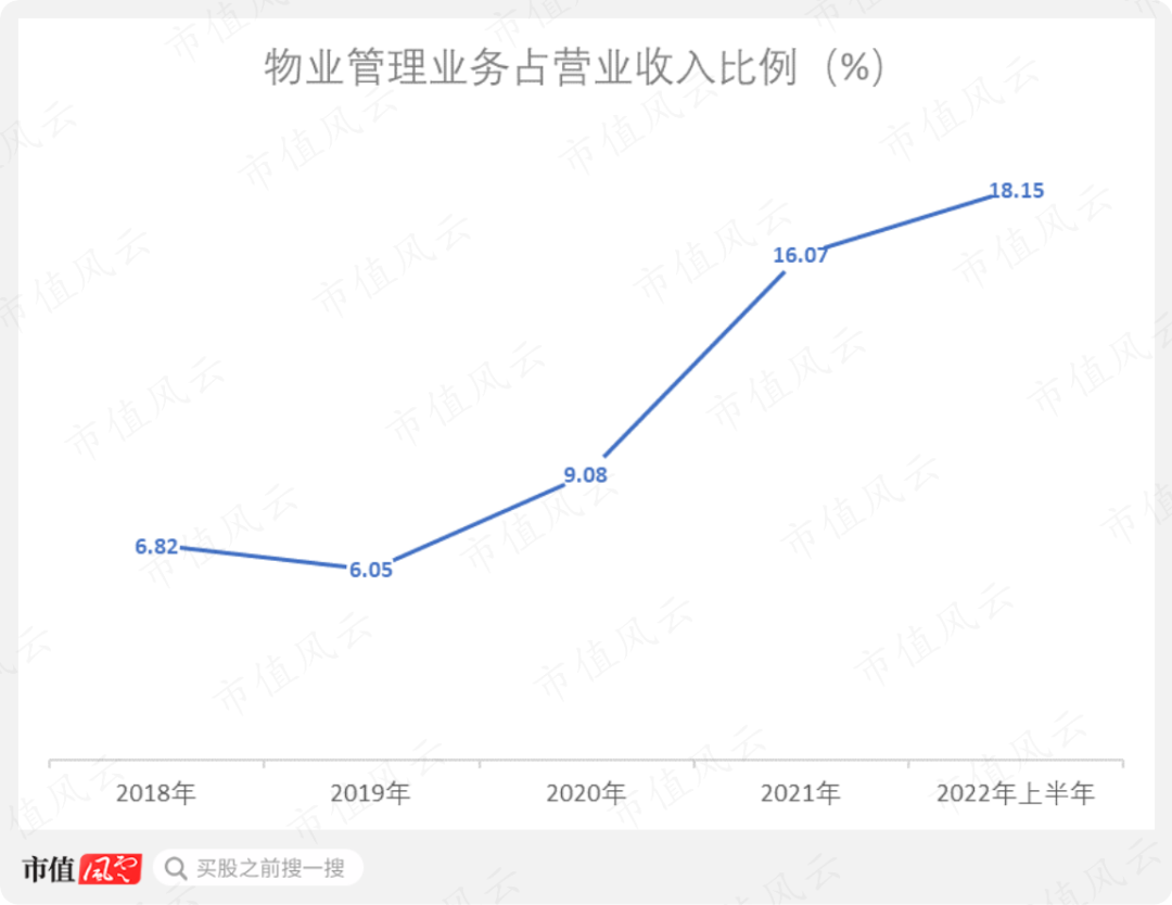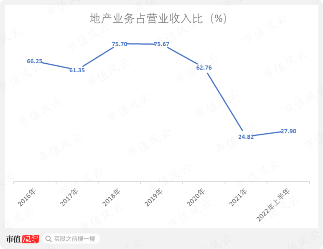 地产业务占总营收比在2018-2019年较高,达到76%,2022年上半年已降至28%以下。