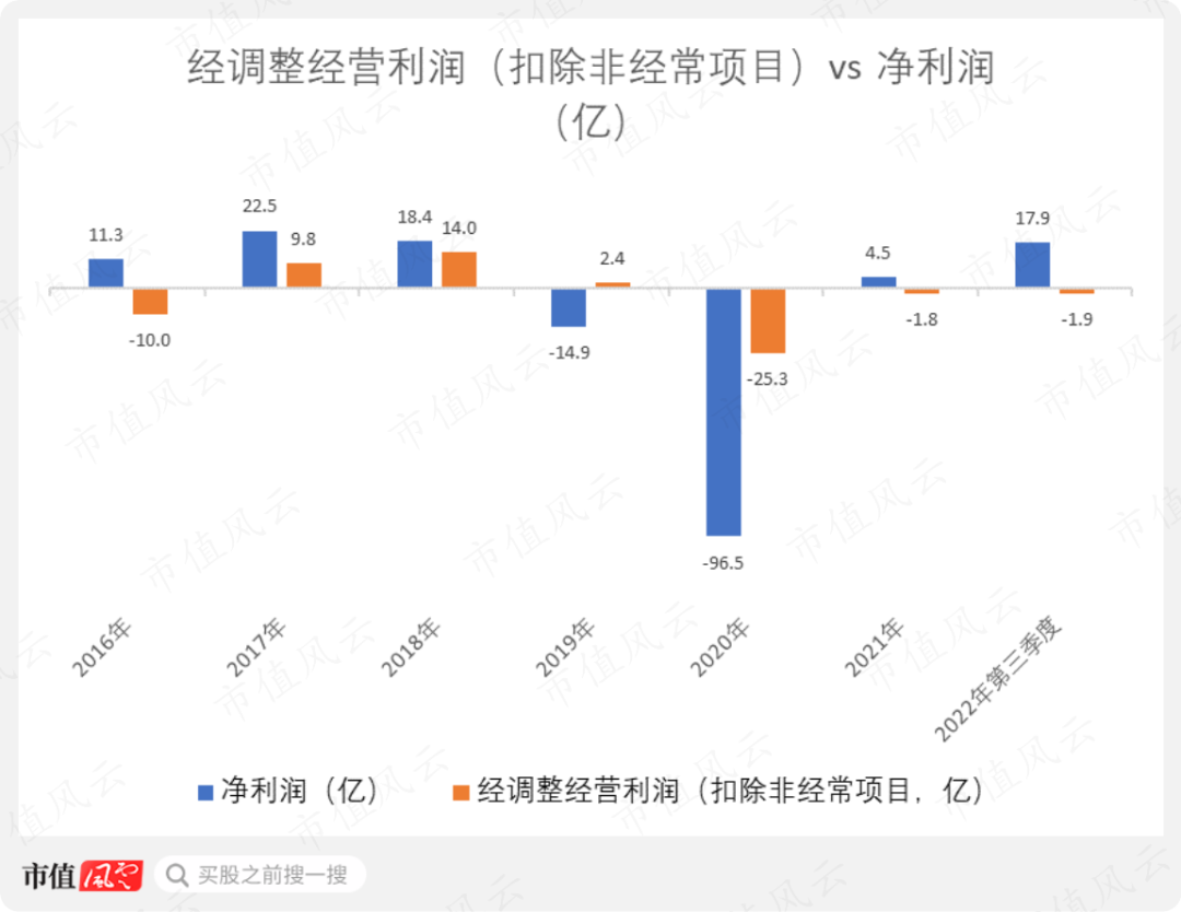 而且,2021年和2022年第三季度,扣非经营利润依然是负数,之所以两次净利润能成为正数,非经常项目功不可没。