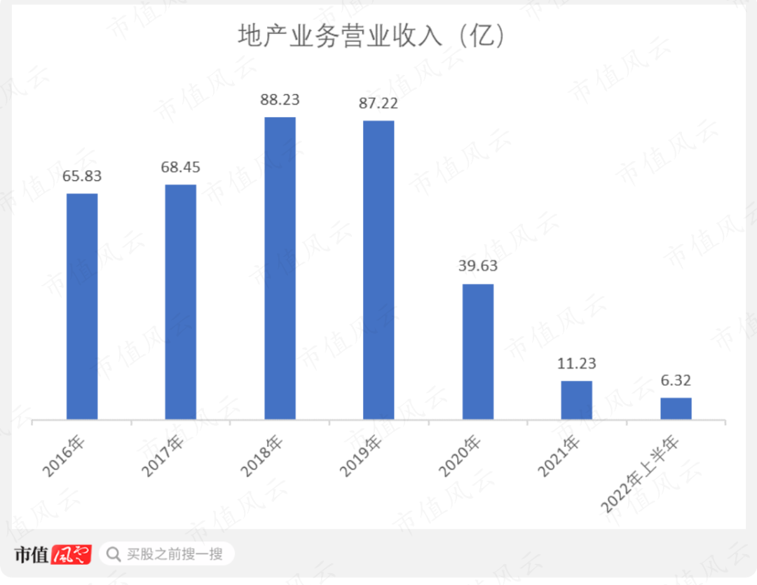 时间趋势上,地产业务营收在2018年达到峰值,88.23亿。而后在2020年起,战略方向改变,降至2022年上半年的6.32亿。