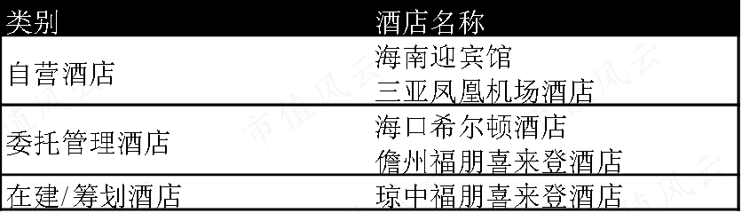 酒店业务方面,现有自营酒店2家(海南迎宾馆、三亚凤凰机场酒店);委托管理酒店2家(海口希尔顿酒店、儋州福朋喜来登酒店);在建及筹划酒店1家(琼中福朋喜来登酒店),运营与筹建客房约2,000间。