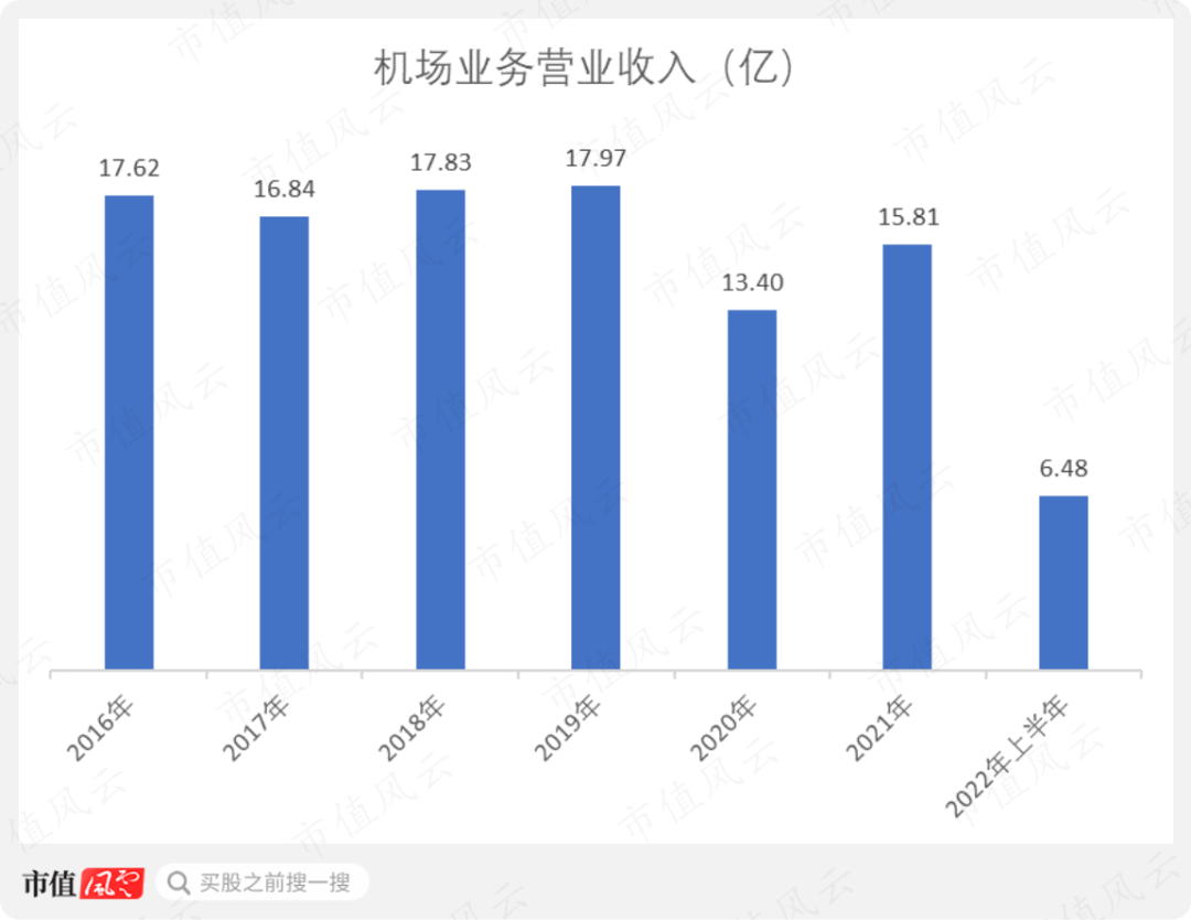机场业务的营业收入,在2016-2019年相对稳定。但2020年起,因疫情而有所下滑,2022年上半年的营收6.48亿。