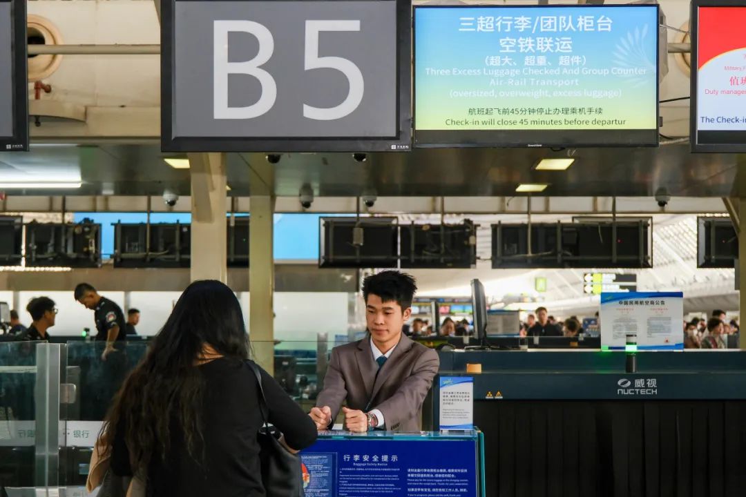 针对节假日出行有托运行李的空铁换乘旅客,美兰机场在T1出发厅开设空铁联运专柜,同时,考虑到晚到旅客、轮椅旅客、老年旅客、孕妇等特殊旅客的出行需求,美兰机场将特殊旅客专柜设置在值班经理柜台邻近位置,通过前站通报和现场人工、标识指引的方式,帮助空铁换乘晚到旅客快速办理乘机手续,同时为老年旅客、轮椅旅客以及其他需要帮扶的换乘旅客佩戴接力式服务手环,在后续的乘机过程中提供优先值机、过检、登机等服务。