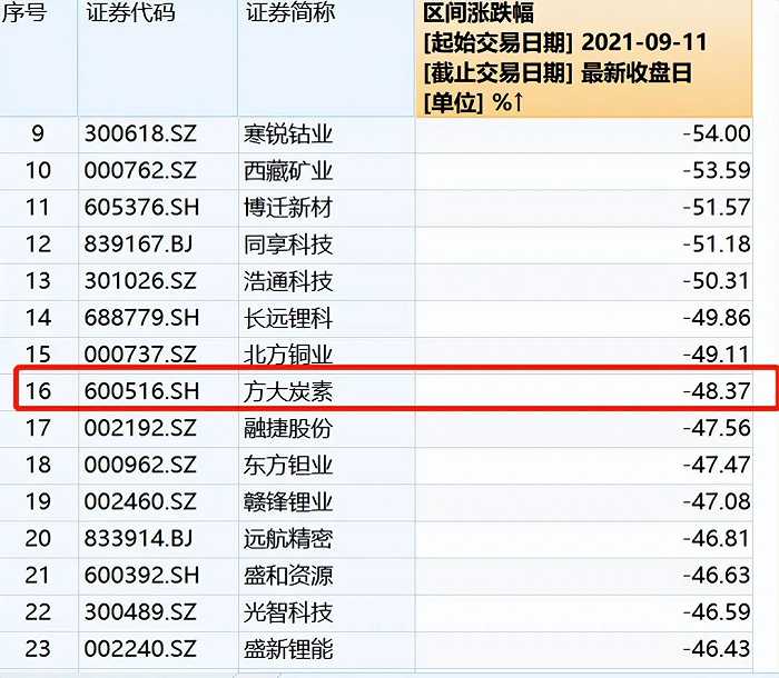 若将方大炭素放在A股万得“金属非金属”板块中比较,127家上市公司,自2021年9月11至上周五,平均涨幅-19.6%,方大炭素在此期间累计涨幅为-48.4%,跌幅排在第16位,也就是说方大炭素跑输111家(大约九成)公司。