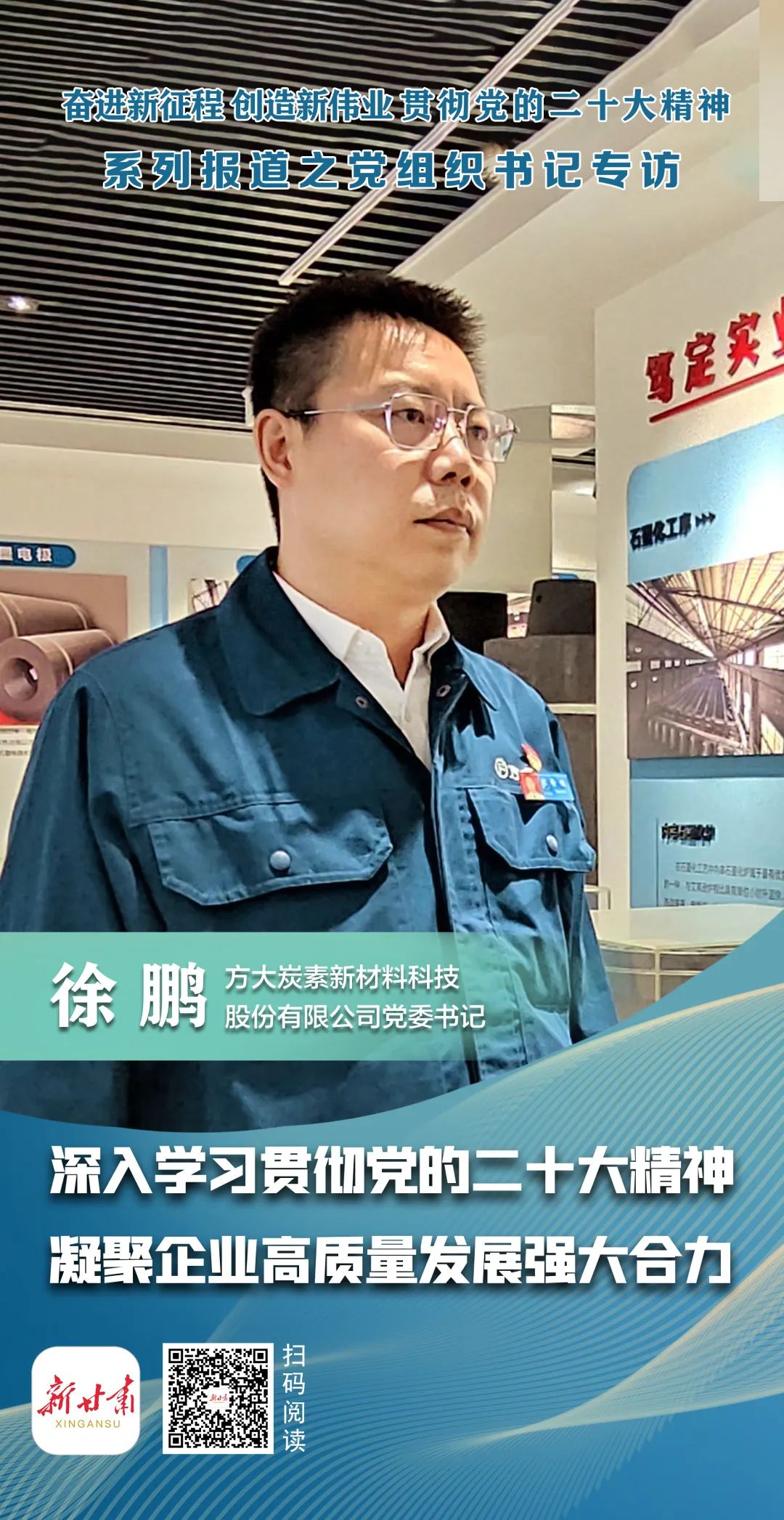 “党的二十大报告提出,建设现代化产业体系。坚持把发展经济的着力点放在实体经济上,推进新型工业化,加快建设制造强国、质量强国、航天强国、交通强国、网络强国、数字中国。这为实体企业加快发展指明了方向、增强了信心。”徐鹏表示,方大炭素作为国家科技兴贸创新基地龙头企业、甘肃省技术创新示范企业和甘肃省战略性新兴产业骨干企业,将全面贯彻党的二十大精神,以振兴民族炭素工业为己任,走稳走好高质量发展之路,为加快建设幸福美好新甘肃、不断开创富民兴陇新局面贡献民营企业力量。