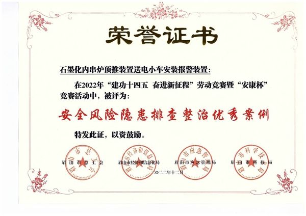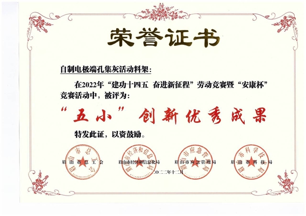 近日,眉山方大炭素收到四川省总工会《关于命名四川省职工“五小”活动先进集体和优秀成果的通知》,公司申报的《36室焙烧增加强冷风机项目》荣获四川省职工“五小”活动优秀成果奖。这是公司继去年荣获“四川省基层工会职工之家阵地建设项目”称号及“四川省职工心灵驿站”称号后又一省级荣誉。