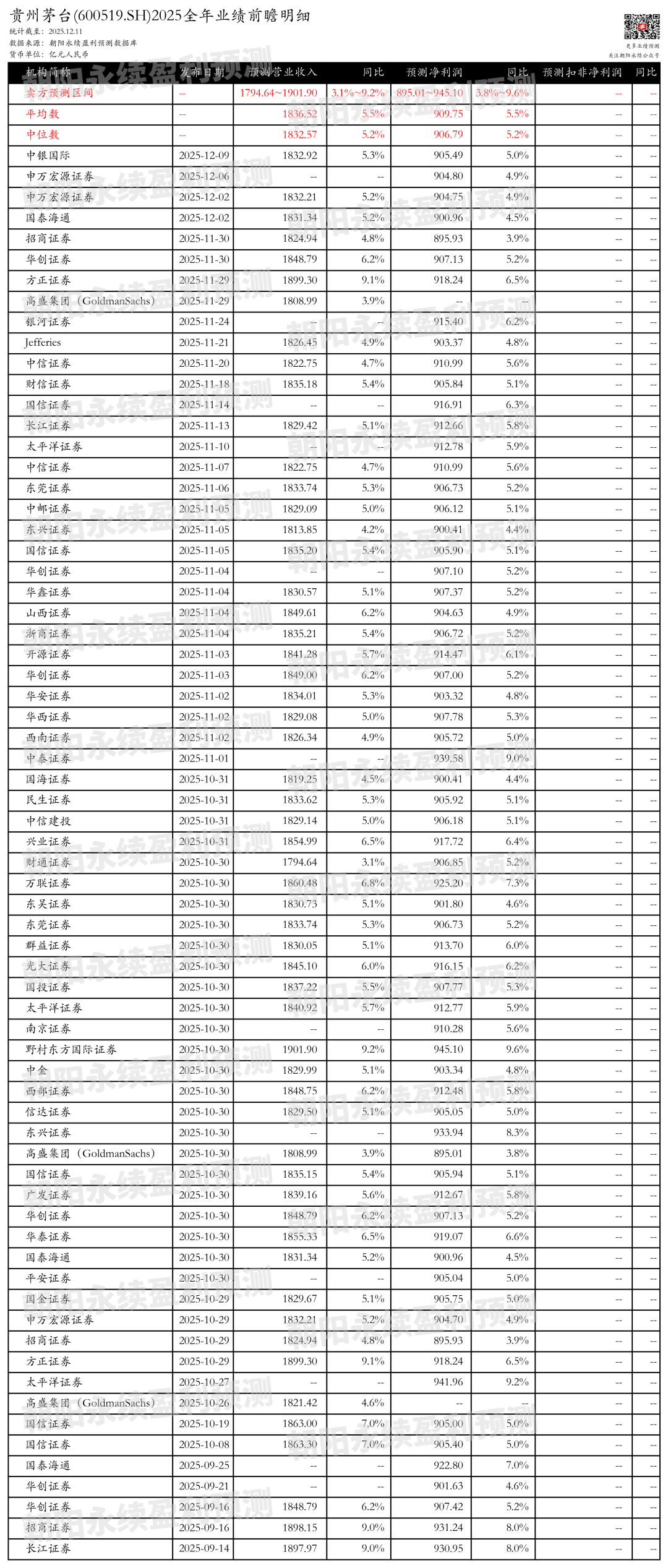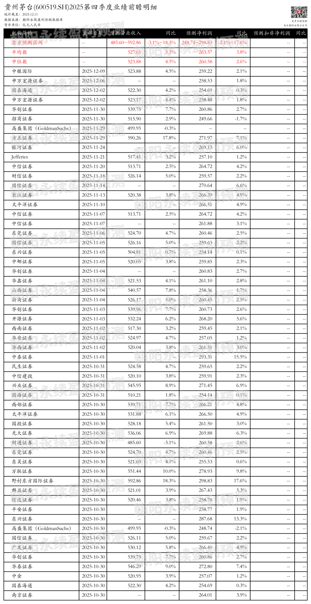 截至2025年12月11日,根据朝阳永续季度业绩前瞻数据:
