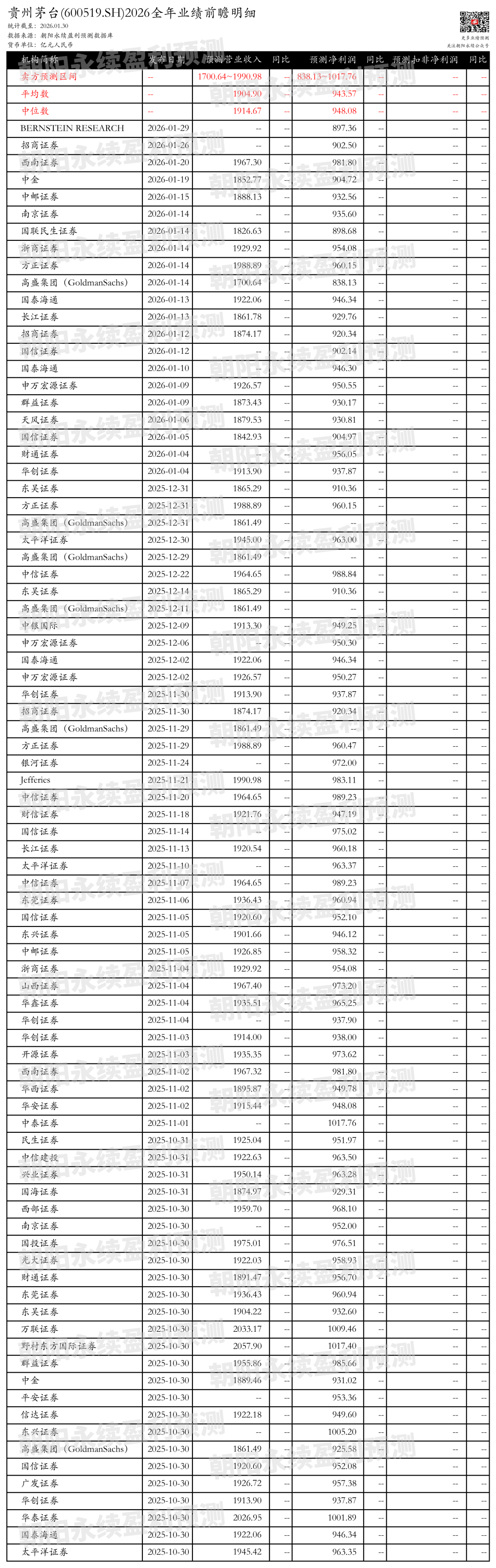 预测营业收入1700.64~1990.98亿元;预测净利润838.13~1017.76亿元。