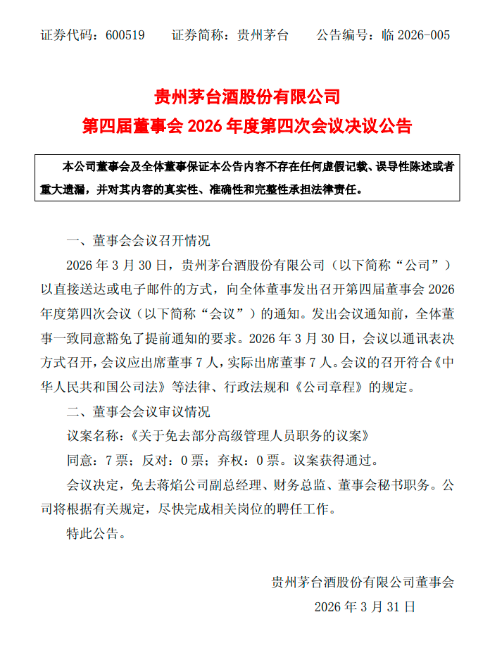 昨晚,贵州茅台发布公决定免去蒋焰副总经理、财务总监、董事会秘书职务,公司将按规定尽快完成相关岗位聘任工作。