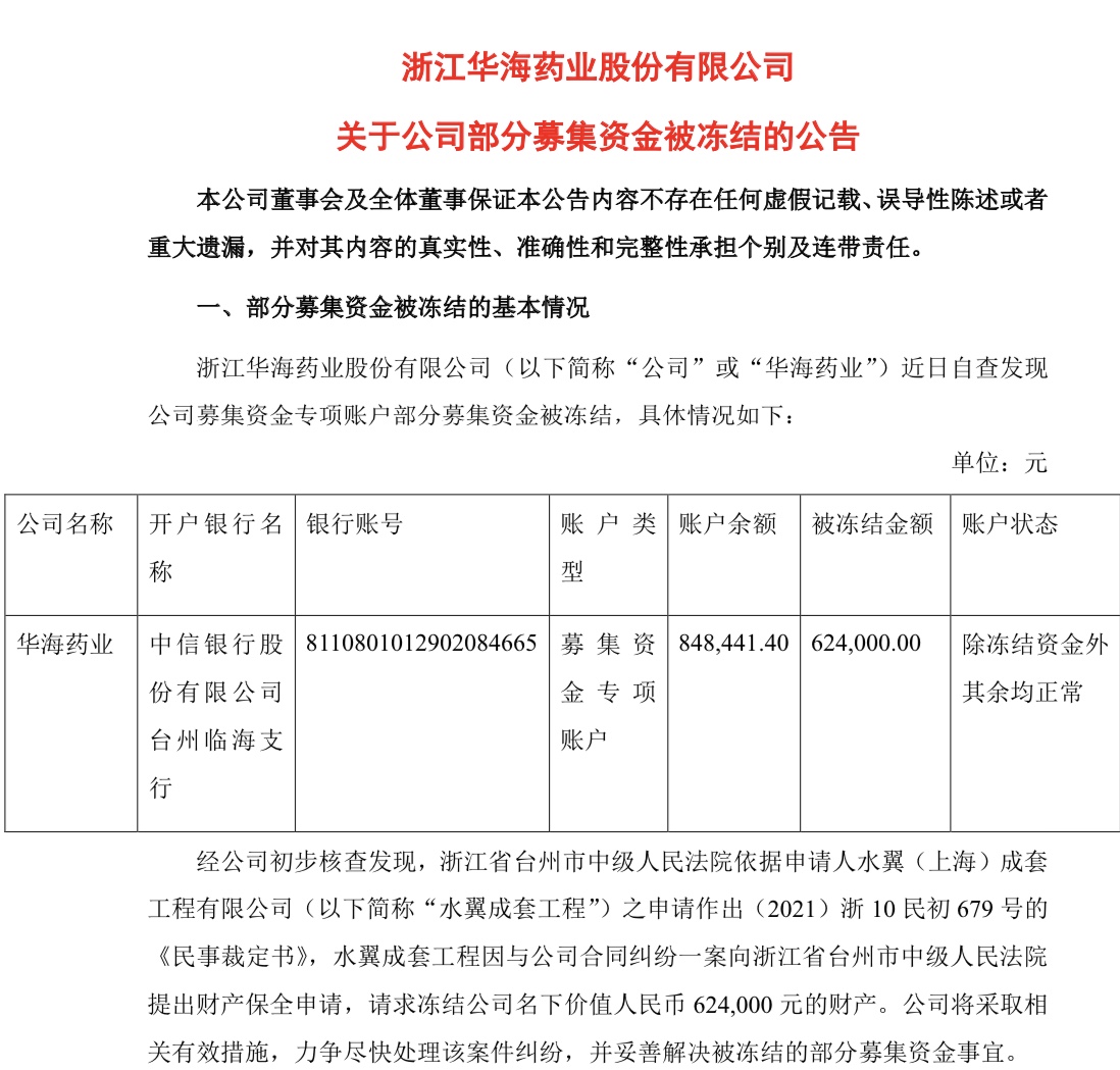 华海药业表示,本次被冻结的募集资金专项账户部分募集资金金额为62.40万元,占最近一期经审计净资产的0.0093%,募集资金专项账户仅用于募集资金的储蓄和使用,且其中被冻结的金额较小,不会对其募集资金项目的开展造成重大影响。