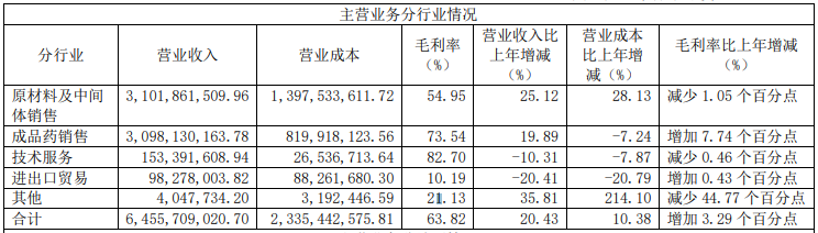 主营业务分行业情况方面,原材料及中间体销售的营业收入为31.02亿元,同比上涨25.12%,毛利率为54.95%,同比下降1.05%;成品药销售的营业收入为30.98亿元,同比上涨19.89%,毛利率为73.54%,同比上涨7.74%;技术服务的营业收入为1.53亿元,同比下降10.31%,毛利率为82.70%,同比下降0.46%;进出口贸易的营业收入为0.98亿元,同比下降20.41%,毛利率为10.19%,同比上涨0.43%。