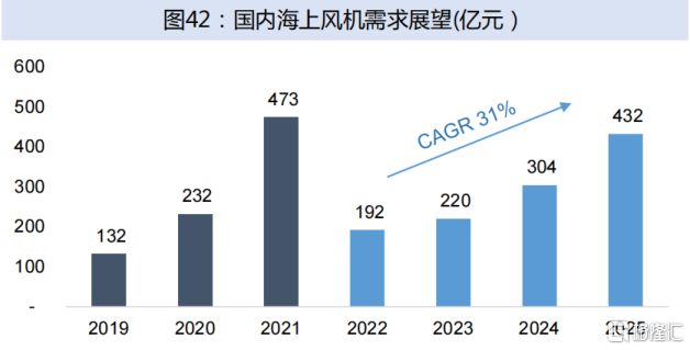 未来随着风机大型化发展,海上风机的单位kW成本和售价将快速下降,因此参考价格和销量的综合因素,国信证券预测2022年-2025年我国平价海风阶段风机市场规模将从192亿元增长到432亿元,复合增速为31%。