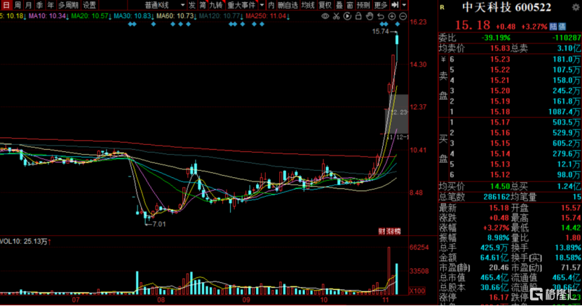 今日,中天科技早盘继续高开,盘中一度强势创下历史新高,截至收盘,市值站上465亿元报15.17元,成交额超64亿元。