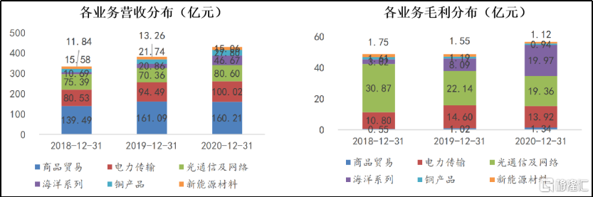 可以看出,海洋、电力和光通信三板块形成公司业绩主要支撑。根据2020年公司营业收入