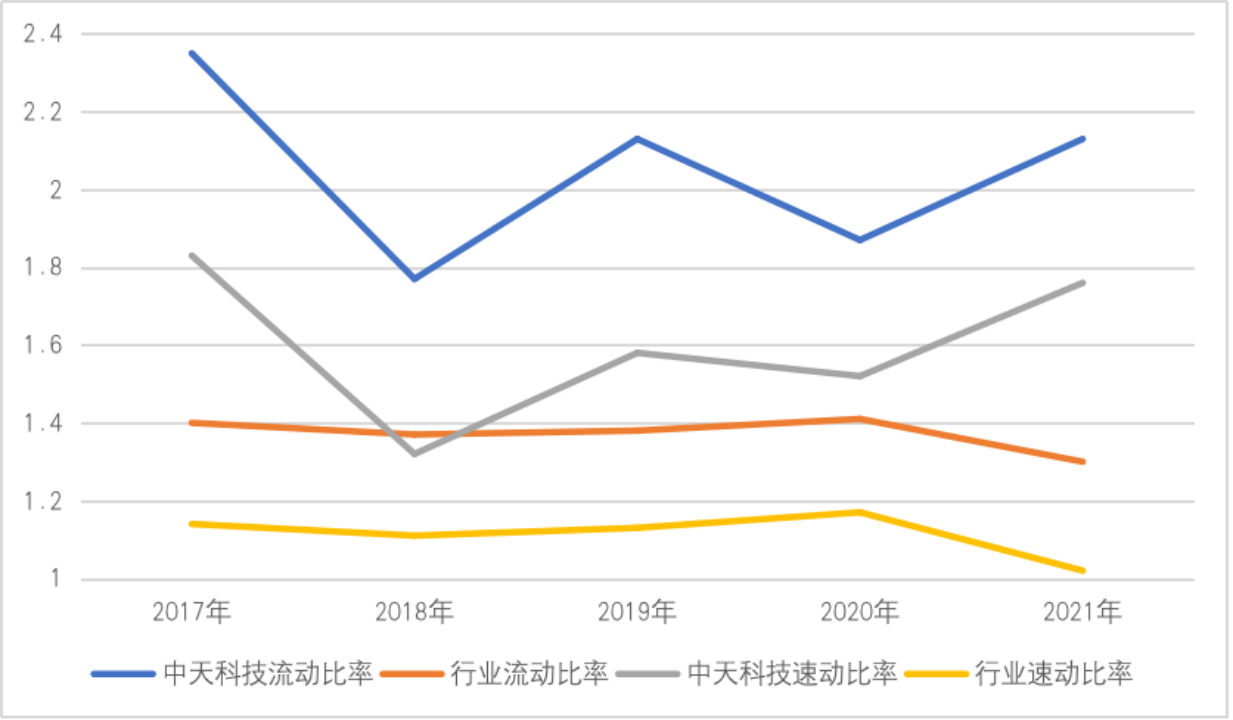 图3 2017年~2021年中天科技和所在行业的流动比率及速动比率变动情况