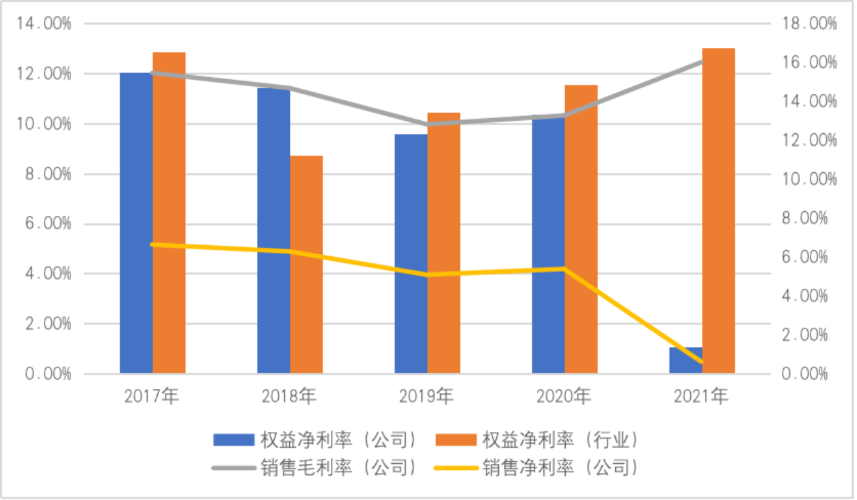 图4 2017年~2021年中天科技和所在行业的盈利能力变动情况