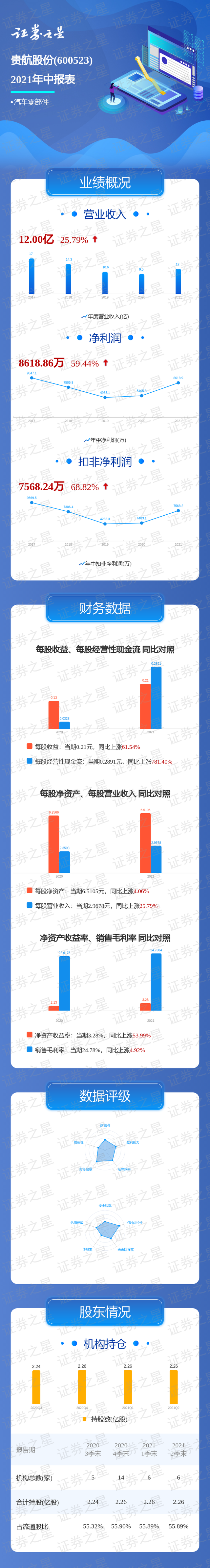 贵航股份2021中报显示,公司主营收入12.0亿元,同比上升25.79%;归母净利润8618.86万元,同比上升59.44%;扣非净利润7568.24万元,同比上升68.82%;负债率15.22%,投资收益621.68万元,财务费用-1252.89万元,毛利率24.78%。