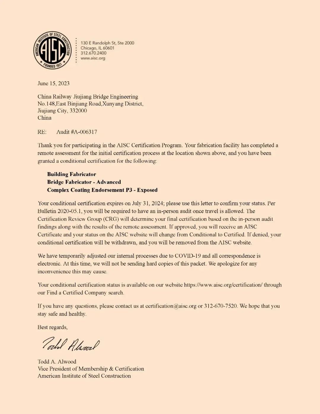 中铁九桥顺利通过美国AISC体系认证,这是公司继取得欧盟CE认证后通过的又一重要认证,标志着公司国际业务质量管理体系、管理水平实现了新的跨越和提升。