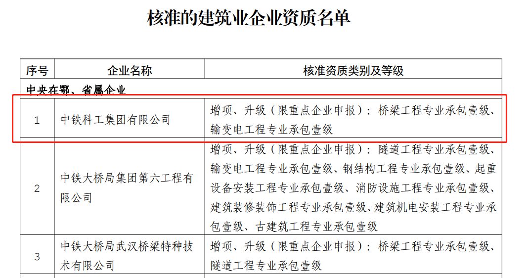 近日,经湖北省住房和城乡建设厅核准,中铁科工喜获桥梁工程专业承包壹级、输变电工程专业承包壹级两项资质,标志着公司在桥梁工程及电力工程业务发展上取得新突破。