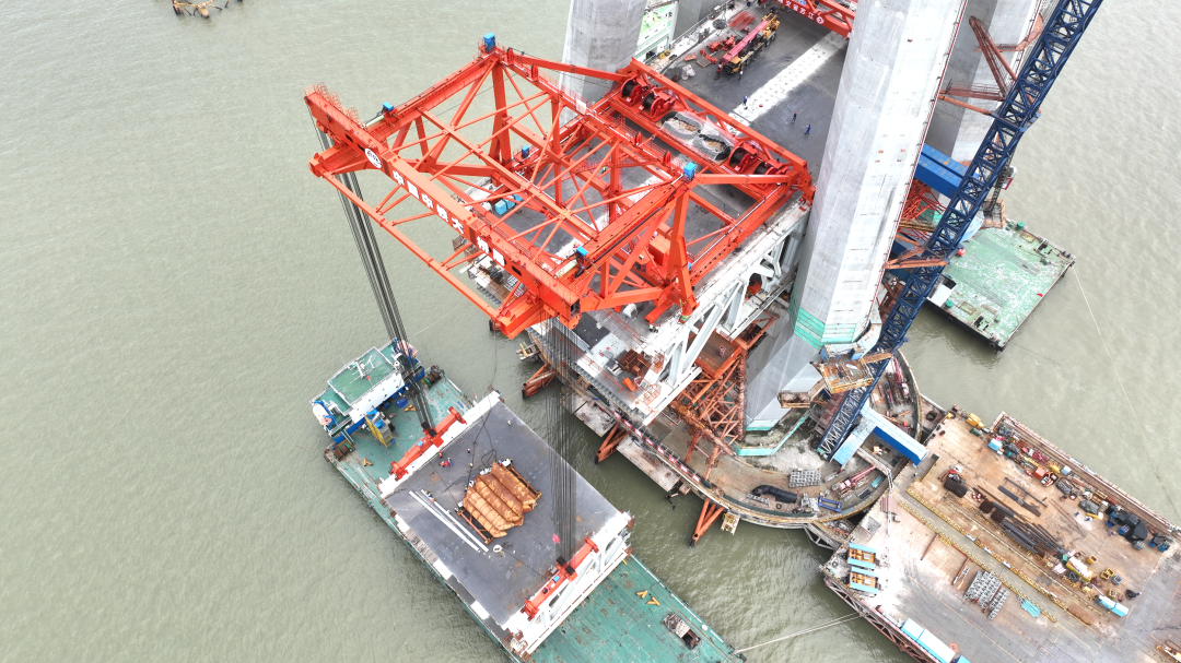 在该项目中,中铁山桥、中铁宝桥分别承建了大桥CT-A6、CT-A5标合同段的钢梁制造,中铁科工研制了架梁吊机等专用设备。此次投入使用的两台BL1700吨架梁吊机单台额定起重量1700吨,起吊幅度为14米至23米。设备整机搭载超大机械锁紧支顶油缸、吊具系统配置纵横摇机构,并多点位布置高精度传感器,保证了整机安全和起吊安全,通过应用自动油缸插拔销机构,实现吊点平移天车自动走行,减少了人工高空作业,智能化水平更高。