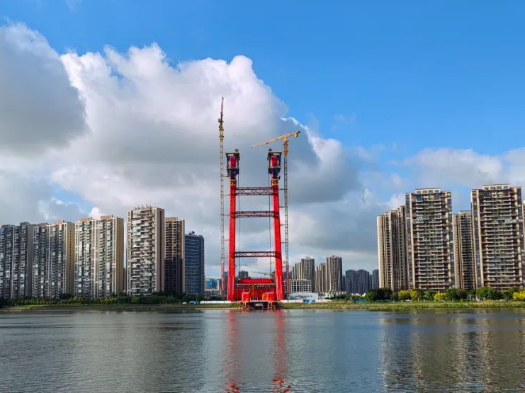 8月2日,由中铁工业旗下中铁宝桥承制的顺德大桥高塔中横梁顺利完成安装,为年底高塔封顶打下坚实的基础。高塔中横梁作为大体积、大吨位的钢构件,采用左右幅两台大吨位智能塔机整体抬吊横梁的方案。
