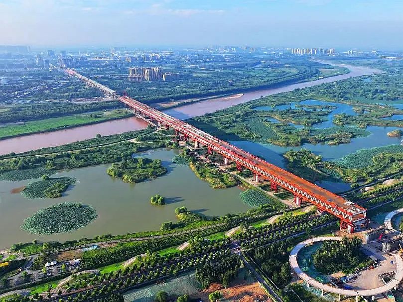 安罗高速黄河特大桥位于新乡市与郑州市之间,全长约15公里,为双边箱钢混组合梁斜拉桥,是黄河上最长、内陆地区钢结构用量最大的公路桥梁,也是河南省黄河上塔高最高、桥宽最宽、技术最复杂的桥梁。大桥钢结构钢材用量达22万吨,中铁工业负责大桥约14万吨钢结构的制安任务,约占64%。项目建成后,将北接雄安、南连武汉,极大缓解京港澳高速和大广高速的通行压力,同时对构建黄河生态经济轴带,助力都市圈一体化融合发展具有重要意义。