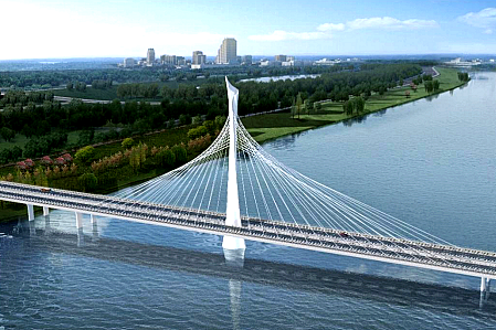 滹沱河特大桥是石家庄新的城市中轴线,全长约2208米,主塔总高146.5米。大桥主桥设计灵感来源于中国山水画卷轴,桥塔造型如缓缓展开的画卷,立于滹沱河之上,配合空间索面,空间和层次感渐次展开,营造出如诗如画的意境,成为“绿水青山就是金山银山”的生动实践。