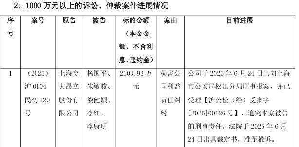 6月24日晚间,交大昂立(600530.SH)发布《关于累计涉及诉讼、仲裁事项的进展公告》,就杨国平、朱敏骏、娄健颖、李红、李康明等五名时任高管损害公司利益责任纠纷(标的金额为2103.93万元),公司于6月24日已向上海市公安局松江分局刑事报案并获受理,同时法院裁定准予民事诉讼撤诉。