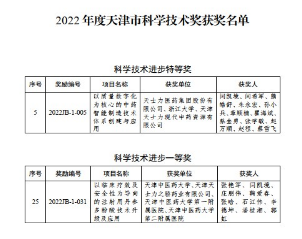 3月20日,天津市人民政府发布了2022年度天津市科学技术奖评选结果。由天士力医药集团牵头完成的“以质量数字化为核心的中药智能制造技术体系创建与应用”喜获市科技进步特等奖,为集团首次获此殊荣。同时,天津天士力之骄药业有限公司参与完成的“以临床疗效及安全性为导向的注射用丹参多酚酸技术升级及应用”荣获市科技进步一等奖。