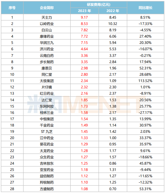 近年来国内企业对中药新药研发热情高涨,研发费用也水涨船高。A股中药企业2023年年报已全部出炉,经笔者统计,2023年研发费用超过1亿元的A股中药企业共有28家,较上一年增加3家。