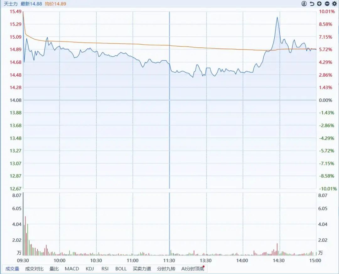 8月5日,天士力复牌后直接涨停板开盘。随后,资金蜂拥而出,至下午1点多,涨幅缩小到2.56%。截止当日收盘,天士力依然大涨5.68%,全天换手率5.81%。
